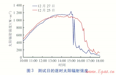 筆者采用江億提出的隨機氣象模型[2],模擬計算測試日逐時太陽輻射強度。模型考慮了天氣變化對太陽輻射強度的影響,通過判定得出逐時天氣狀況,針對不同天氣情況采用相應(yīng)的模型確定太陽輻射強度。l2月25日為全天晴朗的天氣,l2月27日為晴轉(zhuǎn)陰的天氣,兩日的逐時太陽輻射強度見圖3。由圖3可知,12月25日最大太陽輻射強度出現(xiàn)在14:59,為l238W/m2。12月27日最大輻射強度出現(xiàn)在13:33,為l238W/m2。兩日出現(xiàn)最大太陽輻射強度的區(qū)間在13:00—15:00。