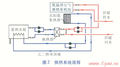 該建筑為拉薩市某多層辦公建筑,建筑共5層,總建筑面積為7500m2,辦公建筑典型層的平面布置見圖1。供暖方式采用以太陽能熱水系統(tǒng)為主、空氣源熱泵為輔的形式,室內(nèi)供暖裝置為風(fēng)機盤管。供暖室內(nèi)設(shè)計溫度為20℃,供、回水溫度為45、40℃。供熱系統(tǒng)流程見圖2。乙二醇水溶液經(jīng)過太陽能集熱器(平板形)加熱后進入蓄熱水箱,蓄熱水箱出水經(jīng)板式換熱器與供暖回水換熱。若換熱后的水溫低于45℃,低溫型空氣源熱泵啟動,將水溫加熱至45℃后供給末端風(fēng)機盤管;若換熱后的水溫達到45℃,低溫型空氣源熱泵不啟動,熱水直接供給末端風(fēng)機盤管。