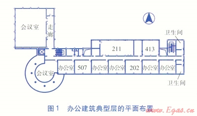選擇4個房間(位置見圖l)進行室內(nèi)熱環(huán)境監(jiān)測,被測房間分別為:南向202、507房間,建筑面積均為64m2;北向211、413房間,建筑面積分別為124、64m2。規(guī)定507房間不開啟風(fēng)機盤管,其他房間均可開啟風(fēng)機盤管供暖。