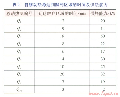 移動熱源(Q1~Q10)至解列區(qū)域M的出救路線見圖4。各移動熱源達到解列區(qū)域的時間及供熱能力見表5。設(shè)解列區(qū)域的最低限額供熱量為50kW,考慮移動熱源到達解列區(qū)域時間以及式(2),得到出救移動熱源順序為Q10、Q5、Q9、Q4,即解列區(qū)域恢復(fù)供熱的最短時間為8min。考慮移動熱源供熱能力后,最優(yōu)出救移動熱源順序為Q5、Q9、Q4,此時解列區(qū)域恢復(fù)供熱的最短時間仍為8min。由算例可知,通過優(yōu)化在出救時間最短標(biāo)準(zhǔn)不變的條件下,出救移動熱源數(shù)量減少,從而提高了移動熱源出救的經(jīng)濟性。