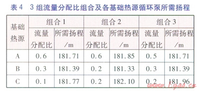 根據(jù)各基礎(chǔ)熱源設(shè)計質(zhì)量流量,經(jīng)計算可得,基礎(chǔ)熱源A~C的流量分配比限額(最大值)分別為0.6、0.3、0.2。在南線出口事故工況下,按照10%步長改變各基礎(chǔ)熱源流量分配比,可得到3組流量分配比組合。按照文獻[8]的計算方法,分別計算3組流量分配比組合中各基礎(chǔ)熱源循環(huán)泵所需揚程。3組流量分配比組合及各基礎(chǔ)熱源循環(huán)泵所需揚程見表4。