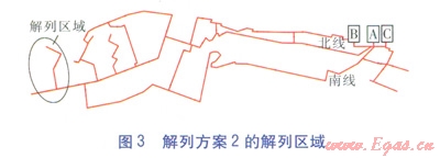 按照解列最不利熱用戶的原則,并根據(jù)閥門設(shè)置情況,選取解列方案1、2。兩種解列方案中解列區(qū)域分別見圖2、3。解列方案1、2的解列區(qū)域分別包括15、34個熱用戶,被解列熱用戶總設(shè)計質(zhì)量流量分別為1030、2220t/h。解列區(qū)域最低限額供熱系數(shù)仍取0.807,則解列方案1、2的解列區(qū)域事故工況下的質(zhì)量流量分別為832、1792t/h。