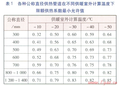 由于目前我國沒有限額供熱系統(tǒng)的具體規(guī)定值,因此參考CHnH 41—02—2003確定。各種公稱直徑供熱管道在不同供暖室外計算溫度下限額供熱系數(shù)最小允許值見表1。