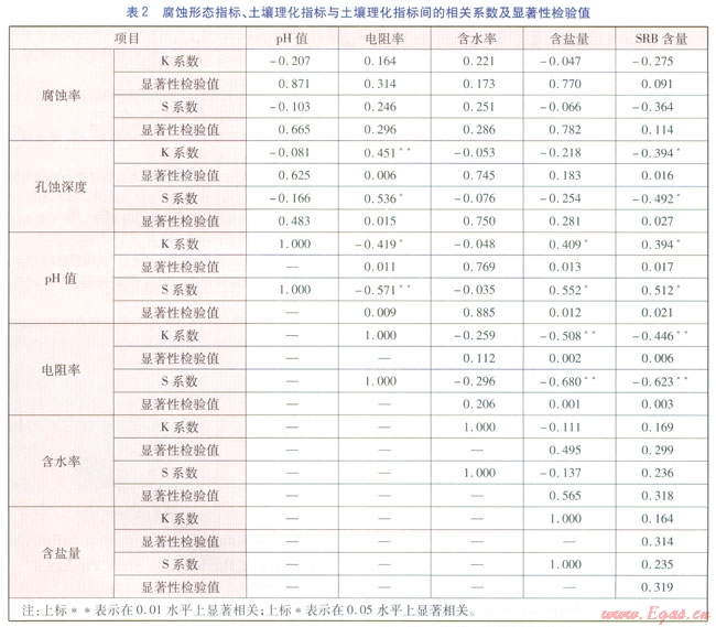 摘 要:分析反映土壤腐蝕性的土壤理化指標?;趯嶒灁?shù)據(jù),評價埋地鋼質(zhì)燃氣管道腐蝕率、孔蝕深度與土壤理化指標(pH值、電阻率、含水率、含鹽量、硫酸鹽還原菌含量)以及土壤理化指標自身之間的相關性。
