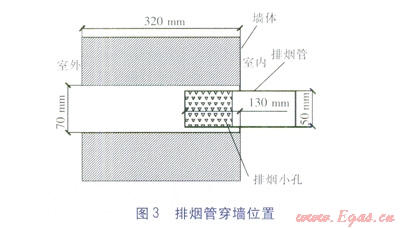 經(jīng)測量,進(jìn)入穿墻孔的排氣管長度只有130mm,并沒有伸出厚度為320mm的穿墻孔,開有多個小孔的排氣管最外端實際仍處于穿墻洞內(nèi)。涉案熱水器工作時煙氣只能排入穿墻孔洞內(nèi)(詳見圖3)。