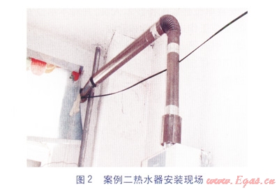事故燃?xì)鉄崴髋艢夤馨惭b不符合GB 6932—2001《家用燃?xì)饪焖贌崴鳌犯戒?span lang="EN-US">A《家用燃?xì)饪焖贌崴靼惭b技術(shù)要求》A4.1.3中防倒風(fēng)罩以上的排氣管室內(nèi)垂直部分不得小于250mm以及排氣管頂端必須安裝有效的防風(fēng)、雨、雪的風(fēng)帽的要求。此種情況下,極易出現(xiàn)在使用熱水器時,由于煙道排氣不暢,甚至出現(xiàn)倒風(fēng),致使燃?xì)馊紵a(chǎn)生的煙氣不能有效排到室外。