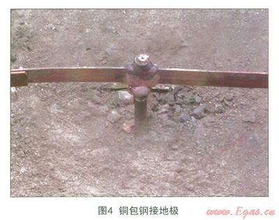 根據(jù)GB/T 50235—2010《工業(yè)金屬管道工程施工及驗(yàn)收規(guī)范》中對(duì)防靜電和防雷電的要求,對(duì)于露空的閥門、閘井中的閥門應(yīng)該進(jìn)行接地處理。在接地時(shí),為了有效地降低與土壤的接觸電阻和接地材料的自身腐蝕,往往會(huì)使用銅包鋼或者銅網(wǎng)等惰性材料接地方式,如圖4所示。