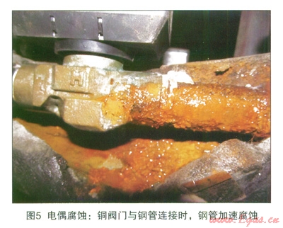 在金屬活動(dòng)順序表中,Fe要比Cu活潑,在相同的環(huán)境中,Fe的電位要比Cu負(fù)。當(dāng)異種金屬相接觸,處于相互連通的電解質(zhì)中時(shí),由于不同金屬之間存在實(shí)際電位差而使電位較低的金屬腐蝕速度比原來(lái)增大,電位較高的金屬的腐蝕速度減小,這種現(xiàn)象稱為電偶腐蝕[4],見圖5所示。當(dāng)鋼與銅相互接觸時(shí),鋼的腐蝕速率比其單獨(dú)存在時(shí)加大。在閥門位置,利用銅包鋼或者銅網(wǎng)進(jìn)行接地時(shí),由于電偶腐蝕的作用,會(huì)加速閥門的腐蝕。同時(shí)由于銅的良好導(dǎo)電性和自腐蝕較低的特性,利用銅材質(zhì)進(jìn)行接地時(shí),接觸電阻要比閥門直接接地更低,在這種情況下,陰極保護(hù)電流集中流入流出的現(xiàn)象會(huì)更加嚴(yán)重。