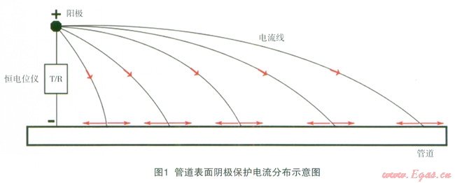 陰極保護(hù)系統(tǒng)電路路徑的構(gòu)成包括:土壤、管道、導(dǎo)線[2]。對(duì)于直流電路來(lái)說(shuō),根據(jù)歐姆定律可以知道,電路中的電流在流動(dòng)過(guò)程中,電流會(huì)始終傾向于在電阻較小的路徑流動(dòng)。當(dāng)管道的防腐層面電阻率變化不大、防腐層沒有出現(xiàn)嚴(yán)重的破損點(diǎn)和接地的情況時(shí),管道表面陰極保護(hù)電流的分布是相對(duì)較為均勻的,如圖1所示。
