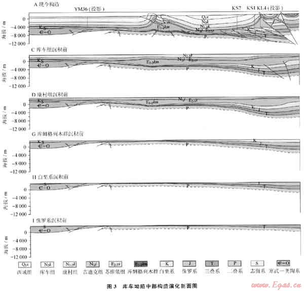 庫車坳陷構造變形主要發(fā)生在新近系以后,康村組沉積后構造活動開始活躍,庫車組中期構造活動最為強烈,持續(xù)至現(xiàn)今仍在活動。古近系沉積前,中生界地層受古隆起構造控制,呈現(xiàn)南薄北厚的楔形體,晚白堊世發(fā)生區(qū)域隆升作用,并沒有發(fā)育明顯的斷裂。古近系-新近系康村組沉積前主要是坳陷發(fā)育階段,構造活動較弱。從圈閉形成與改造角度考慮,庫車坳陷構造演化可劃分為以下3個主要階段(圖3):