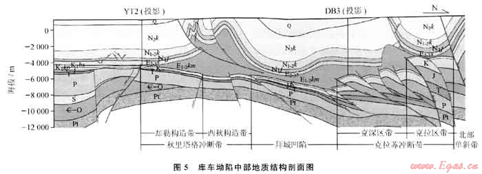 克拉蘇沖斷帶劃分為2個三級構造單元,北部單斜帶靠近山前、沖起幅度較高,構造樣式簡單,為北傾單斜構造,不詳細描述,筆者重點闡述克拉區(qū)帶及克深區(qū)帶的劃分依據(jù),尤其是克深區(qū)帶對天然氣勘探意義重大。