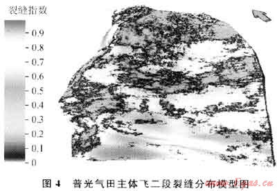 裂縫指數(shù)模型是通過(guò)裂縫研究成果(單井裂縫指數(shù))這一指標(biāo),利用序貫指數(shù)計(jì)算方法建立的裂縫分布模型(圖4)。