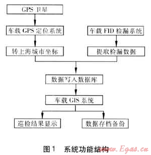 利用公司現(xiàn)有的數(shù)據(jù)和軟件平臺(tái),將車載FID、車載GPS、GIS信息系統(tǒng)三者相結(jié)合,構(gòu)建起市北公司燃?xì)夤芫W(wǎng)泄漏的早期預(yù)警系統(tǒng)。其工作原理為FID檢漏儀檢測(cè)到管網(wǎng)泄漏點(diǎn)后,系統(tǒng)將完成兩項(xiàng)任務(wù),一方面自動(dòng)讀取車載檢漏儀所采集到的數(shù)據(jù),將其寫入數(shù)據(jù)庫(kù);另一方面,安裝在檢漏車上的GPS定位儀自動(dòng)記錄泄漏點(diǎn)的空間坐標(biāo),并轉(zhuǎn)換為上海城市坐標(biāo),供安裝于車載筆記本電腦上的GIS系統(tǒng)使用。GIS系統(tǒng)將GPS傳送的空間坐標(biāo)以及FID采集到的泄漏數(shù)據(jù)整合,進(jìn)行專業(yè)分析、專題顯示,形成相關(guān)的報(bào)告報(bào)表。圖1表示了整個(gè)系統(tǒng)的功能結(jié)構(gòu)。
