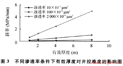 本方法以評價點與起始點間連線的斜率(pHmax/t)即最大關(guān)井井口壓力與恢復(fù)時間的比值來表征關(guān)井壓力恢復(fù)的快慢。那么分析滲透率和有效厚度變化下斜率的表現(xiàn)即可判斷不同滲透率或有效厚度情況下井控難度。