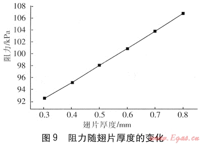 可以看出,翅片厚度對(duì)熱管的傳熱系數(shù)和傳熱量影響很小,但對(duì)阻力影響影響較大。翅片越薄,流動(dòng)阻力越小。因此,應(yīng)盡可能選擇較薄的翅片。但翅片厚度的選取還要從機(jī)械強(qiáng)度、制造工藝以及耐腐蝕等方面進(jìn)行考慮。