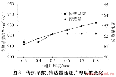 在翅片間距為10mm、蒸發(fā)側(cè)、冷凝側(cè)長(zhǎng)度分別為100mm、熱管外徑為6mm、熱管壁厚為0.5mm、熱管間距為8.5mm時(shí),機(jī)油冷卻器性能隨翅片厚度的變化見(jiàn)圖8、9。由圖8可知,隨著翅片厚度增加,傳熱系數(shù)有少許增加,傳熱量基本不受影響。這是由于翅片厚度增加使得機(jī)油的流通面積減小,流速增加,傳熱系數(shù)也隨之增大。同時(shí)傳熱面積減少,傳熱量變化不大。由圖9可知,隨著翅片厚度的增加,機(jī)油流通面積減小,機(jī)油的流速增加,因此蒸發(fā)側(cè)的阻力增大。