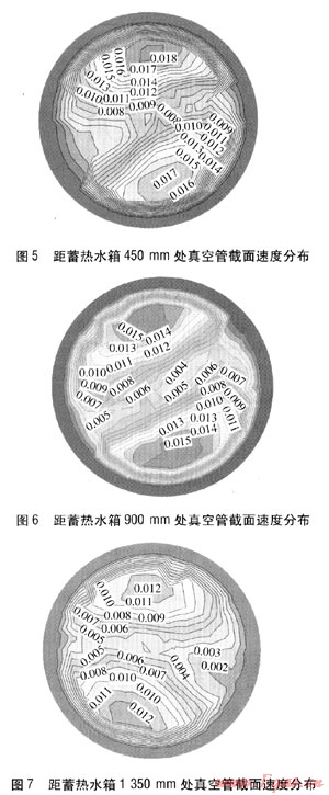 真空管(長度為1800mm)與蓄熱水箱連接處以及距蓄熱水箱450、900、1350mm處的真空管截面速度分布分別見圖4~7,圖中數值單位均為m/s。由圖4~7可知,沿著遠離蓄熱水箱方向,真空管內冷熱流體的速度先增大后減小,在距蓄熱水箱450mm處速度最大。說明在距蓄熱水箱450mm這段真空管內存在冷熱流體的回流混合,造成熱損失,降低了集熱系統(tǒng)的效率,采用引流擋板可以在一定程度上解決該問題[11]。