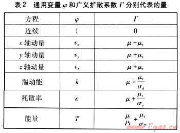 在各個控制方程中,通用變量φ和廣義擴散系數Γ分別代表的量見表2。