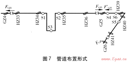 作用在導(dǎo)向支架HZ34、HZ35、HZ41上的彎矩:M34=M35=6883N·m,M41=119 N·m。HZ34、HZ35、HZ41受力(豎直向下):F34=F35=6883N,F(xiàn)41=265N。鉸鏈波紋管補(bǔ)償器S1、S2、S3作用在固定支座GZ4、GZ5的力:FGZ4=1198N,F(xiàn)GZ5=1198N。鉸鏈波紋管補(bǔ)償器S4、S5、s6作用在固定支座GZ5、GZ6的力:F’GZ5=384N,F(xiàn)GZ6=2682N。計(jì)算表明,新增管道對(duì)管道支架及固定支座影響很小。