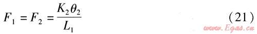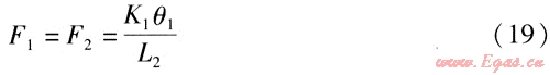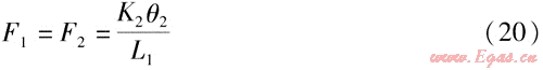 鉸鏈波紋管補(bǔ)償器具有較高強(qiáng)度,可以傳遞荷載,并由于自身構(gòu)件承受管道介質(zhì)的內(nèi)壓推力(盲板力),作用在固定支座上的力很小,方便了管道系統(tǒng)的設(shè)計(jì)以及固定支座的設(shè)計(jì)與施工。6種典型管系中固定支座的受力分析見(jiàn)圖1~6,F(xiàn)1、F2為鉸鏈波紋管補(bǔ)償器作用在固定支座上的力,單位為N。6種典型管系中鉸鏈波紋管補(bǔ)償器工作時(shí)作用在固定支座上力的計(jì)算如下。