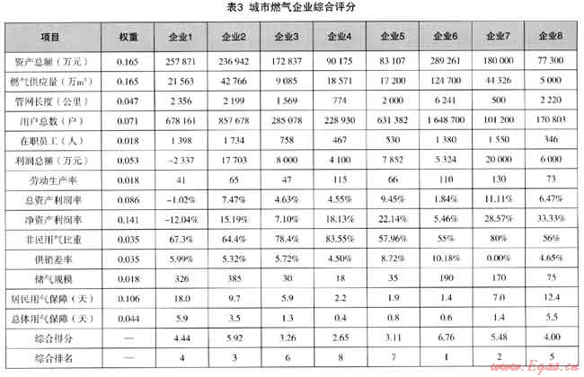 根據(jù)已經(jīng)建立的評價體系,我們對國內(nèi)12家運營較規(guī)范燃?xì)馄髽I(yè)進(jìn)行了調(diào)研,并從中選擇數(shù)據(jù)反饋完整的8家企業(yè)進(jìn)行比較。根據(jù)8家企業(yè)經(jīng)營指標(biāo)(截止至2010年底)的相對優(yōu)劣,分別計算每個企業(yè)每個項目得分(0分-10分),各項加權(quán)匯總后為企業(yè)綜合得分。(見表3)