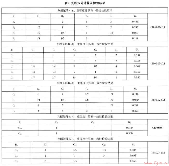 我們在調(diào)研中反復(fù)向業(yè)內(nèi)專家咨詢,綜合各位專家意見,并結(jié)合調(diào)研數(shù)據(jù),建立了判斷矩陣,并根據(jù)層次分析的一般方法(和積法),計算各要素的權(quán)重和進(jìn)行一致性檢驗。限于篇幅,計算過程不詳細(xì)敘述,結(jié)果見表2。