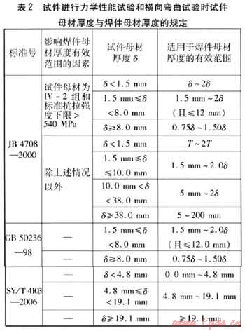 試件進行力學(xué)性能試驗和橫向彎曲試驗時試件厚度與焊件母材厚度的規(guī)定見表2。