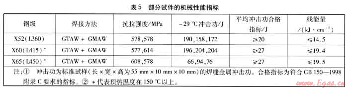 燃氣調(diào)壓裝置制造公司可根據(jù)自身特點,選用國內(nèi)焊接材料,在管線鋼的焊接中采用SMAW+GMAW和GTAW+GMAW,焊后試件各項機械性能指標(biāo)均達到規(guī)范要求。焊材和部分試件機械性能指標(biāo)見表4、5。