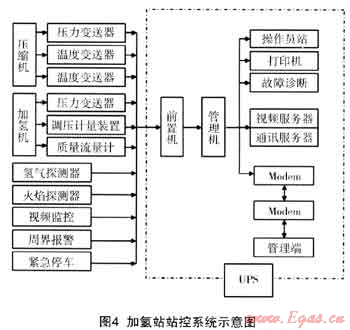 站控制系統(tǒng)采用分布、分級的控制方式,分散控制、集中管理,整個加氫站的站控系統(tǒng)由兩級計算機組成。前置機(下位機)負責(zé)實時數(shù)據(jù)的采集功能;管理機(上位機)用于完成數(shù)據(jù)信號接受處理、顯示、記錄、控制和數(shù)據(jù)上傳。在控制室集中顯示加氫站內(nèi)所有檢測儀表、閥門狀態(tài)、可燃氣體檢測等信號的監(jiān)測,以及對閥門實現(xiàn)自動控制。站控系統(tǒng)可監(jiān)視、控制整個加氫站運行的全過程,計算所需的技術(shù)參數(shù),自動繪制參數(shù)的實時和歷史趨勢曲線。對站區(qū)采集的數(shù)據(jù)包括卸氣系統(tǒng)、增壓系統(tǒng)、儲氫系統(tǒng)、可燃氣體檢測系統(tǒng)、火焰探測系統(tǒng)、視頻監(jiān)控系統(tǒng)及加氣系統(tǒng)等所有數(shù)據(jù)。