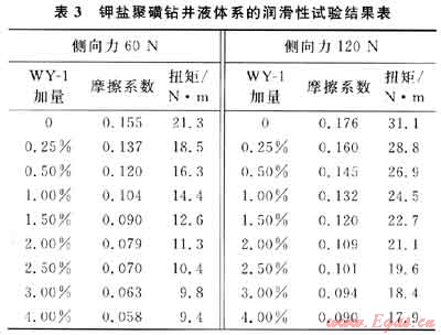 采用上述鉆井液配方,改變潤滑劑WY-1的加量,借助DA-11動(dòng)態(tài)模擬潤滑儀測其在不同側(cè)向力條件下的摩擦系數(shù)和扭矩,觀察在不同側(cè)向力下體系的潤滑性能,結(jié)果見表3。
