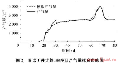 晉試1井巖心觀察及電鏡掃描結(jié)果顯示,鉆遇的煤層裂縫發(fā)育,分布不均勻,裂隙與層面斜交或平行展布。圖2是模型計算的晉試1井前80d的日產(chǎn)氣量與實際日產(chǎn)氣量的擬合曲線,計算過程中采用時間步長為1d,通過對初始參數(shù)進行調(diào)整,使模型模擬計算的日產(chǎn)氣量與實際日產(chǎn)氣量達到較好的擬合效果。由此表明,利用此模型進行考慮吸附變形的煤層氣分階段流動過程的驗證及對產(chǎn)量進行預測是可行的。