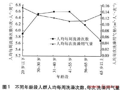 不同年齡段人群人均每周洗澡次數(shù)、人均每次洗澡用氣量見圖1。由圖1可知,對于不同年齡段人群,人均每周洗澡次數(shù)曲線呈兩邊低中間高的形態(tài),20~55歲年齡段的人群洗澡比較頻繁,65歲以上年齡段人群人均每周洗澡次數(shù)最低,這也與該年齡段的生理狀況有關。人均每次洗澡用氣量曲線呈中間低兩邊高相態(tài),由此可知,洗澡次數(shù)越頻繁,每次洗澡用氣量越小。