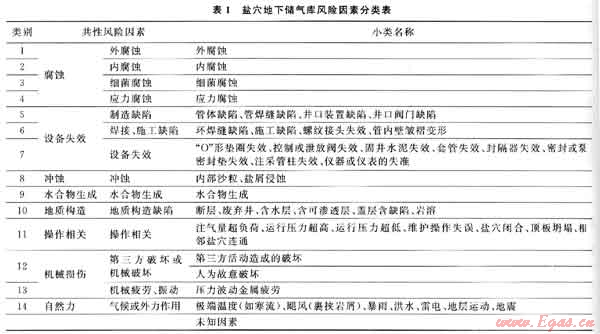 通過(guò)對(duì)地下溶腔、注采管柱、注采井口、天然氣處理系統(tǒng)、壓縮機(jī)組、工藝管路和地面集輸管線7個(gè)子單元的工作過(guò)程系統(tǒng)分析,并結(jié)合事故原因統(tǒng)計(jì)分析結(jié)果和借鑒管道風(fēng)險(xiǎn)因素歸類(lèi)方法,確定了鹽穴地下儲(chǔ)氣庫(kù)風(fēng)險(xiǎn),包括腐蝕、設(shè)備失效、沖蝕、水合物生成、地質(zhì)構(gòu)造、操作相關(guān)、機(jī)械損傷以及自然力8類(lèi)共性風(fēng)險(xiǎn),可細(xì)分為14大類(lèi)和45小類(lèi)風(fēng)險(xiǎn)因素(表1)。