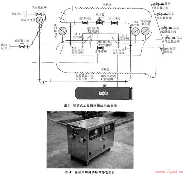 根據(jù)以上分析可知,由于LNG鋼瓶組為現(xiàn)成的外接設(shè)備,小型移動式天然氣臨時供應(yīng)裝置的設(shè)計(jì)關(guān)鍵就是集增熱、調(diào)壓及加臭于一體的橇裝設(shè)備的設(shè)計(jì),這里將其定義為移動式加臭調(diào)壓箱,其結(jié)構(gòu)示意圖如圖3所示。