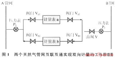 如圖1所示:壓力表P1、P2分別用于檢測(cè)天然氣管網(wǎng)A、B的壓力值p1、p2,(p1-p2)為兩個(gè)天然氣管網(wǎng)的壓力差值;計(jì)量?jī)x表a與閥門Va1、Va2組成A管網(wǎng)向B管網(wǎng)輸氣的通道;計(jì)量?jī)x表b與閥門Vb1、Vb2組成B管網(wǎng)向A管網(wǎng)輸氣的通道。計(jì)量?jī)x表前后閥門是自動(dòng)啟閉的電磁閥,也可以由人工控制。