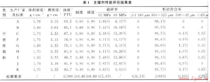 依據(jù)行業(yè)標(biāo)準(zhǔn)SY/T 5108—2006《壓裂支撐劑性能指標(biāo)及測試推薦方法》相關(guān)規(guī)定,對(duì)現(xiàn)場抽取的9家(種)支撐劑樣品進(jìn)行了分類性能評(píng)價(jià),結(jié)果見表1。