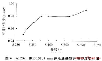根據(jù)各井儲層孔隙壓力情況及安全鉆井密度窗口,選擇密度合適的VERSACLEAN油基鉆井液。以A12Sah井為例,該井儲層段采用密度為0.95g/cm3高油水比油基鉆井液開鉆,隨著現(xiàn)場鉆井過程中屏蔽暫堵材料的不斷補(bǔ)充及鉆屑固相含量的增加,至該井段完鉆時鉆井液密度為0.99g/cm3(圖4)。