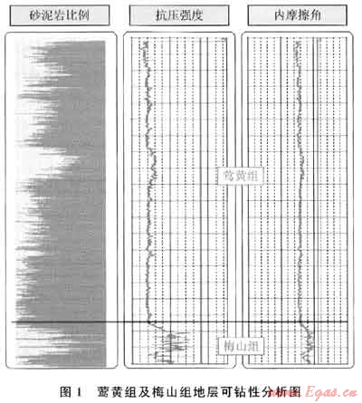Φ311.15mm井段面臨著井段長、作業(yè)時間長、地層跨度大、下部層位石灰質(zhì)含量高、二次造斜等諸多挑戰(zhàn),鉆頭選型是否合理,關(guān)系到整口井的時效高低。本井段穿越鶯黃組下部、梅山組、三亞組(部分井缺失)地層,鶯黃組下部地層較為均質(zhì),地層抗壓強(qiáng)度介于34.5~55.2MPa,內(nèi)摩擦角在35°以下,具有較好的可鉆性;梅山組地層埋深大,地層抗壓強(qiáng)度介于55.2~103.4MPa,部分層位石灰質(zhì)含量高,內(nèi)摩擦角介于36°~40°,對鉆頭的抗沖擊性及抗研磨性具有較高的要求(圖1)。