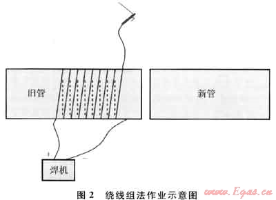 用直流電焊機的手焊鉗線在帶磁管道上順時針或反時針纏繞若干圈,纏繞匝數根據管道的磁場強弱決定,一般選用8~10圈為宜,其作業(yè)示意圖如圖2所示。繞線時如發(fā)現管口磁性變大,則需全部拆除,重新反向纏繞。