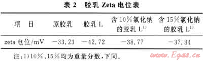 從表2可以看出,耐鹽膠乳和含穩(wěn)定劑的膠乳L(zhǎng)的zeta電位分別為-33.23mV和-42.72mV,由此可見(jiàn)穩(wěn)定劑的加入,有利于提高膠乳的穩(wěn)定性。含10%的氯化鈉和含15%氯化鈉的膠乳L(zhǎng)的zeta電位分別為-38.77mV和-37.34mV,由于NaCl的加入,使得鈉離子向擴(kuò)散層擴(kuò)散,降低了乳液的zeta電位,即降低了膠乳的穩(wěn)定性,即使這樣,由于穩(wěn)定劑的存在,使得含鹽膠乳的zeta電位仍大于不含穩(wěn)定劑的原膠乳的zeta電位,即含鹽膠乳L(zhǎng)仍比原膠乳穩(wěn)定。