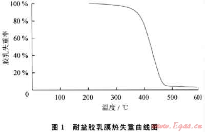 此外,為保證耐鹽膠乳在水泥石中發(fā)揮作用,保證膠乳具有較好的熱穩(wěn)定性是必要的。耐鹽膠乳的熱失重曲線如圖1所示,從圖1可以看出,膠乳在250℃下沒(méi)有明顯降解。表明耐鹽膠乳的理論使用溫度為200℃(BHCT)。結(jié)合DSC測(cè)試結(jié)果,表明耐鹽膠乳理論適用溫度范圍為-18~200℃。