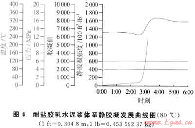 氣井固井的主要風(fēng)險(xiǎn)之一是發(fā)生環(huán)空氣竄。嚴(yán)重的環(huán)空氣竄可能導(dǎo)致很高的井口壓力和氣體流動(dòng),不僅使后續(xù)鉆井工程和開(kāi)采工程無(wú)法進(jìn)行,還可能造成全井報(bào)廢的惡果。根據(jù)Sabins理論,水泥漿的防氣竄性能可以通過(guò)參數(shù)“過(guò)渡時(shí)間”來(lái)預(yù)測(cè),該時(shí)間越短防氣竄性能越好[6]。耐鹽膠乳水泥漿體系在80℃的靜膠凝強(qiáng)度發(fā)展情況如圖4所示。從圖4可以看出,水泥漿體系過(guò)渡時(shí)間較短(為20min),有助于防止氣竄的發(fā)生。