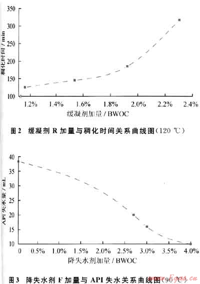 由于作為抗衡離子的Na+會(huì)擴(kuò)散到陰離子聚電解質(zhì)分子鏈周?chē)?,屏蔽聚電解質(zhì)自身所帶負(fù)電荷,降低聚合物分子鏈間斥力,導(dǎo)致聚合物分子鏈蜷縮,從而使得普通型外加劑性能變差,因此,必須開(kāi)發(fā)耐鹽型外加劑。本研究成功開(kāi)發(fā)了耐鹽型的緩凝劑R和降失水劑F。通過(guò)調(diào)整緩凝劑R的加量,水泥漿稠化時(shí)間可調(diào),緩凝劑加量在120℃下對(duì)稠化時(shí)間的影響如圖2所示。水泥漿的API失水隨F加量變化如圖3所示,水泥漿的失水在試驗(yàn)條件下能控制在50mL以內(nèi)。