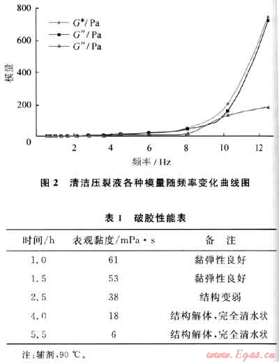 采用控制應(yīng)力流變儀測試該清潔壓裂液的彈性模量(G′)、黏性模量(G″)及復(fù)合模量(G*)情況如圖2所示,具有頻率敏感性。當(dāng)剪切速率和溫度恒定時,壓裂液的G′、G″、G*以及表觀黏度均保持恒定;在不同的頻率下,體系的儲能模量始終大于損耗模量,屬彈體流體。可見該體系具有良好黏彈性、抗剪切穩(wěn)定性、攜砂性能。