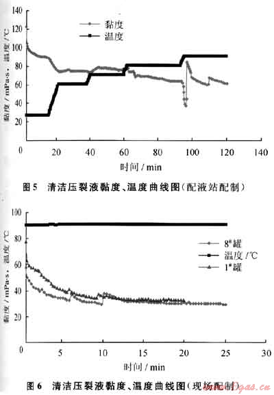 為確保壓裂液質(zhì)量,分別取配液站配制和現(xiàn)場配制壓裂液采用HAAKE-VT550流變儀進(jìn)行實(shí)驗(yàn)評價(圖5、6)。由圖可見,采用配液站罐內(nèi)水配制的清潔壓裂液黏度比配液站清水配制的清潔壓裂液黏度低50%(從60mPa·s下降至30mPa·s),說明水質(zhì)對清潔壓裂液黏度影響很大,但仍能滿足壓裂要求。