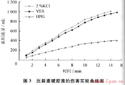 采用巖心流動實(shí)驗(yàn)裝置評價該壓裂液對巖心的傷害,其狀況如圖3所示。胍膠壓裂液破膠液在通過API導(dǎo)流槽時,由于破膠液中存在殘渣,使累計體積隨時間的增長越來越慢,最后漸漸地趨向于零,傷害嚴(yán)重。而所研制的VES壓裂液破膠液通過API導(dǎo)流槽時,表現(xiàn)出了與2%KCl溶液相似的流動特性,該壓裂液對支撐裂縫帶的傷害非常小。