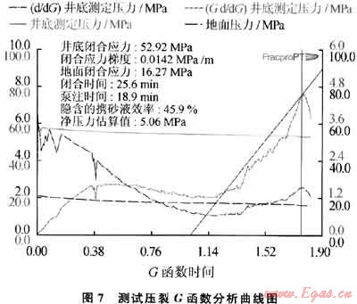 考慮該地區(qū)壓裂施工壓力普遍較高,故首先進(jìn)行測試壓裂。測試壓裂實(shí)際入井液量55m3。測試壓裂G函數(shù)分析曲線見圖7。對測試壓力分別進(jìn)行停泵壓力分析、壓降G函數(shù)分析和壓降雙對數(shù)分析以及平方根分析,井底閉合應(yīng)力梯度14.3kPa/m,閉合時間25.6min,凈壓力4.6MPa。施工排量5.Om3/min時清潔壓裂液體系摩阻僅為清水摩阻的1/3,說明清潔壓裂體系摩阻比常規(guī)胍膠體系要小。