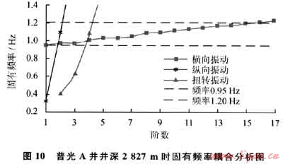 計算結果如圖3所示。從圖3可以看出,隨著鉆柱長度的增加,整體鉆柱的扭轉振動固有頻率逐漸減小。圖3中,出現(xiàn)了扭轉振動固有頻率在1Hz的情況,轉換成臨界轉速為60r/min,與實際空氣鉆井過程中采用的轉盤轉速60~70r/min非常接近,鉆柱就容易發(fā)生共振。因此,應該根據(jù)不同的鉆柱長度,調整轉盤轉速,避免產(chǎn)生鉆柱扭轉共振。