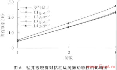 由于鉆井液的存在,鉆柱在進行軸向運動的時候,受到鉆井液的黏滯作用。根據(jù)鉆井液的流變特性,其密度越高,黏度越大,對鉆柱軸向運動的阻礙作用越明顯??梢?,鉆井液會對鉆柱縱向振動的固有頻率產(chǎn)生很大影響,改變縱向振動的臨界轉速,這種影響必須引起足夠的重視。