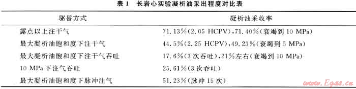 長(zhǎng)巖心實(shí)驗(yàn)結(jié)果表明,裂縫-孔洞型碳酸鹽巖凝析氣藏的單井吞吐不能有效提高凝析油采收率,對(duì)有兩口井以上的裂縫單元,應(yīng)考慮露點(diǎn)壓力以上直接注氣或最大凝析油飽和度下脈沖注氣方式來進(jìn)行開發(fā)。露點(diǎn)壓力以上由于凝析油不析出,因此采收率最高。